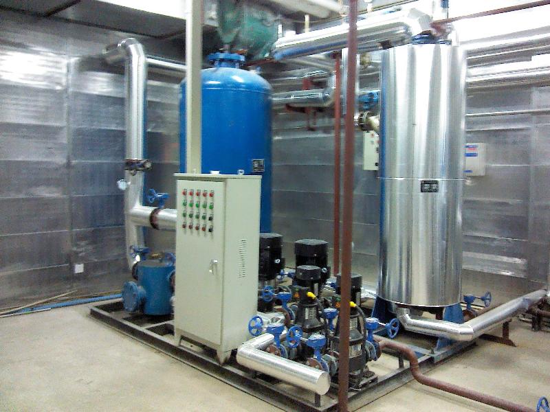 采暖回水系統(tǒng)的二次水經(jīng)除污器、循環(huán)泵,打入水品浮動盤管換熱器殼程,被管程的一次熱煤強(qiáng)化加熱,達(dá)到規(guī)定溫度后送入二次水循環(huán)系統(tǒng),由于泄露或其它原因損失的水理,以保持系統(tǒng)恒壓供水。膨脹水箱不僅貯存系統(tǒng)的膨脹水,而且還可向系統(tǒng)定壓補(bǔ)水,確保系統(tǒng)水不汽化和供水平穩(wěn)。